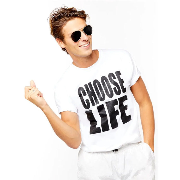 Transform into the legendary George Michael with our "Choose Life" t-shirt. Embrace the rebellious spirit of the '80s with the iconic white T-shirt, distressed denim, and a sleek black leather jacket. Complete the look with aviator sunglasses for the full Wham! experience.