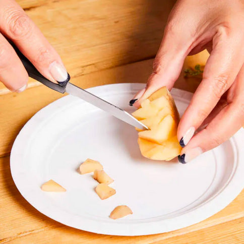 You can even use a paper template to get your shape. Draw it out on your piece of paper, then centre the design over your potato. Use a paperclip tip to poke holes along the edges of the design, so that when you remove the paper the outline of the pattern is already there. Take your knife to finish off the design as we did above.