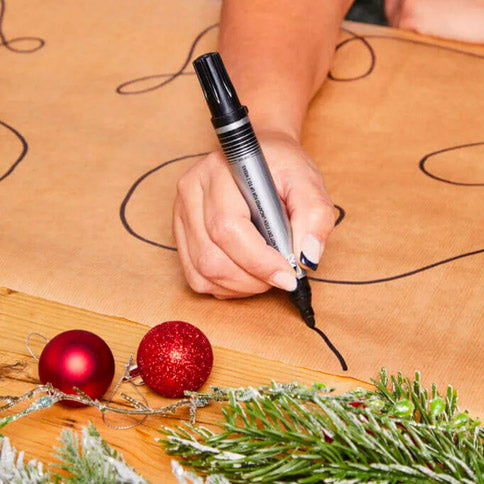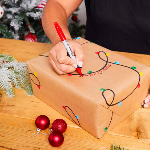Use your newly decorated paper to wrap up your gift, then if you like you can choose a coloured Sharpie to draw a special message along one of the strings.