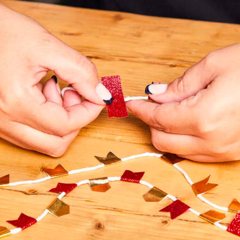 You can lay the string out flat on the table to work on, or you could use some washing pegs to hang the string up between two objects and then work along it. This ensures all your flags are hanging the same way!