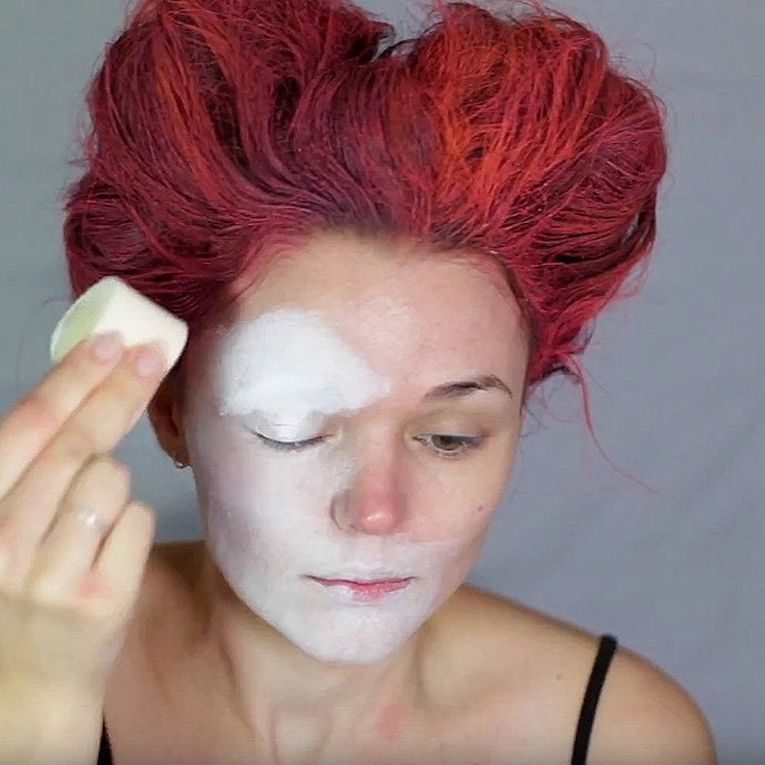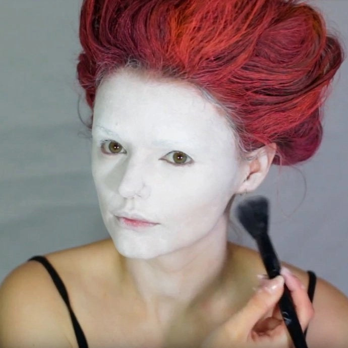 Now to do the Queen of Hearts face paint! Start by painting your face and neck with white face paint like this.