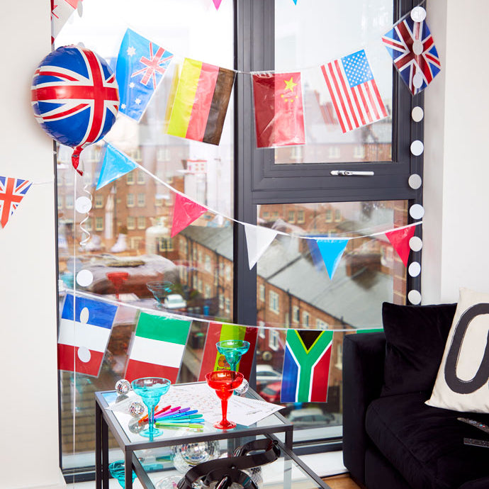 Every party, Eurovision-themed or otherwise, needs to start with decorations. A good tip for this kind of event is to not overcomplicate things, flags are a simple yet effective décor for international events like Eurovision and the Olympics. Flag bunting or larger flags are perfect for decorating the room or outside area where your party will be! For our Eurovision party, we chose multi-nation flag bunting along with Union Jack flags for a nod to the host nation.