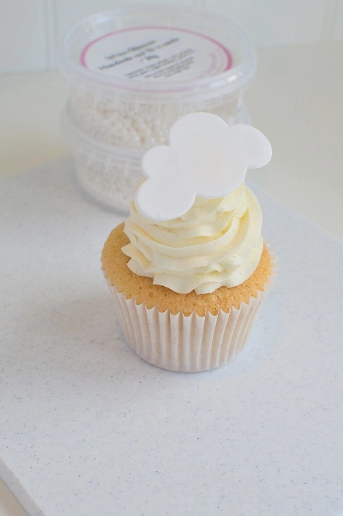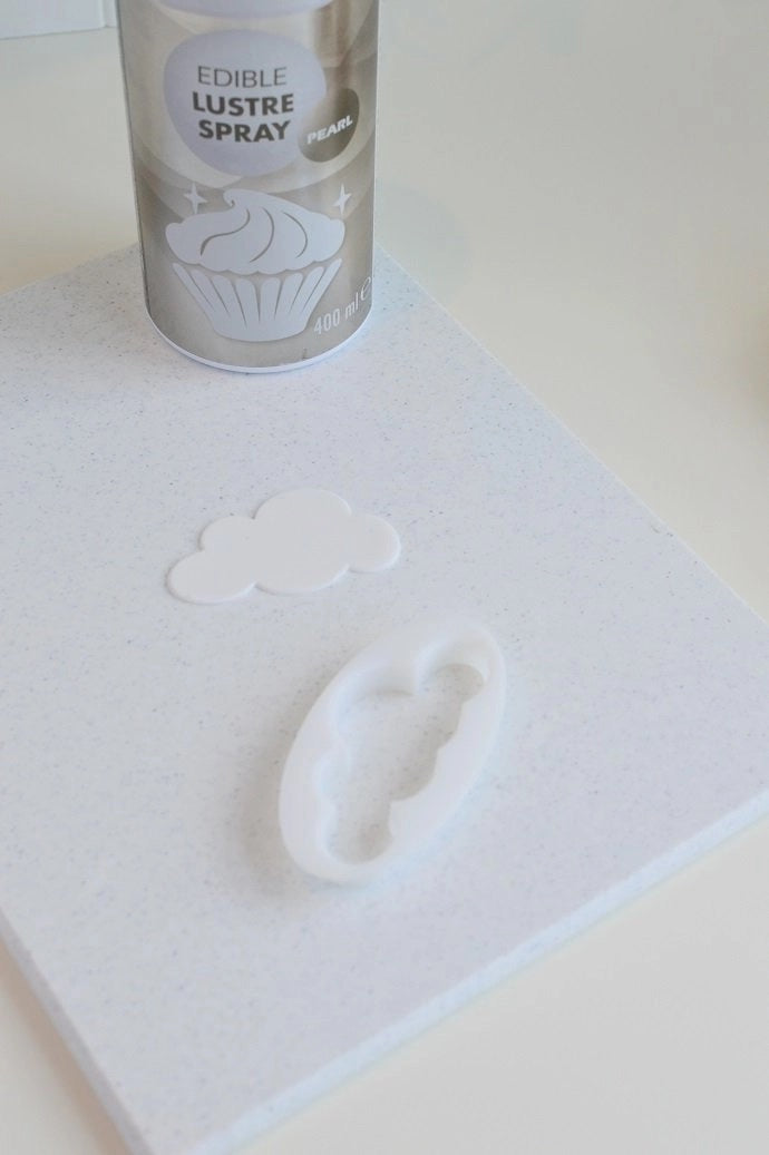 While your cupcakes are cooling, you can start making the cloud cupcake toppers! Take a small ball of white flower paste and roll it out until it’s 2mm thick. Then use a cloud cookie cutter or a knife to cut out 14 clouds and leave them to one side.