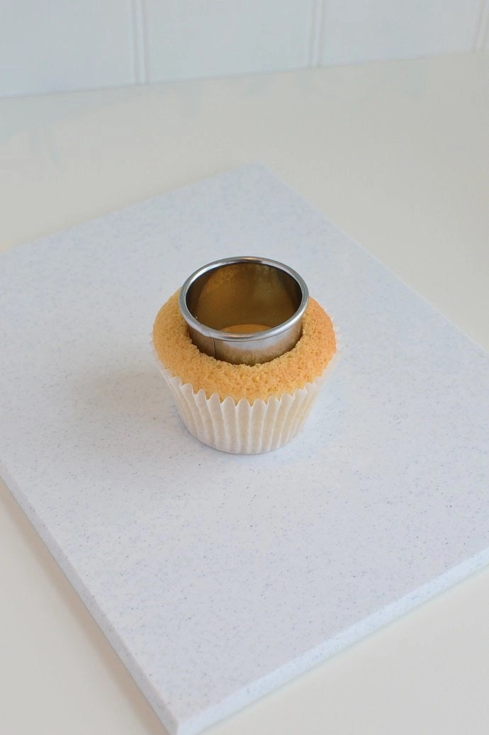 While the cupcakes are still warm, place a round metal cookie cutter onto the middle of the cupcake and push it 3/4 of the way down. (Be careful not to push it all the way down to the bottom of the cupcake).