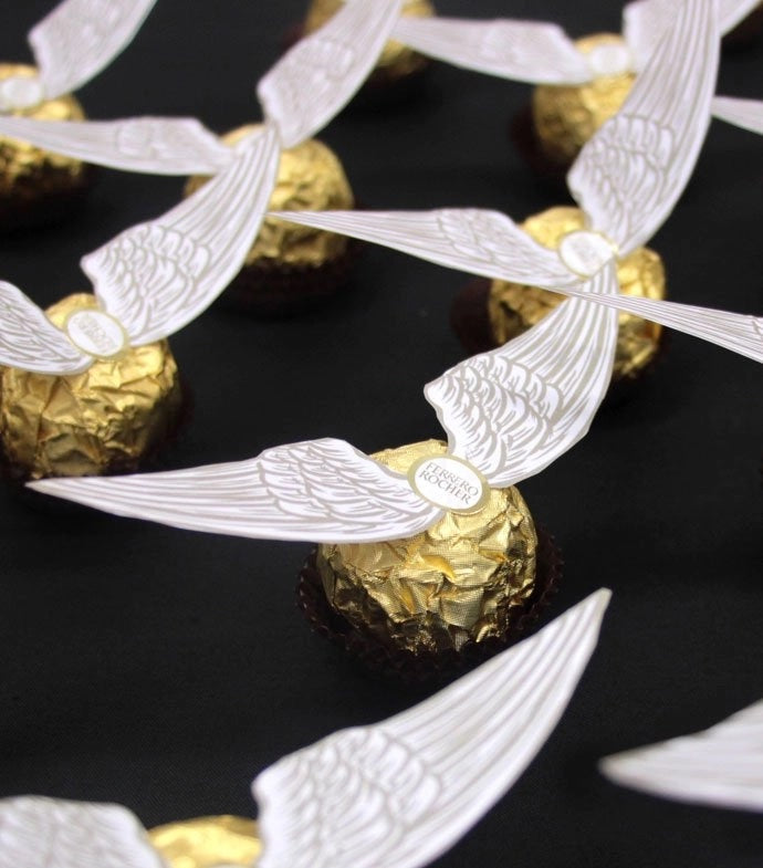 - Make as many Ferrero Rocher golden snitches as you need and display them on a serving platter amongst the rest of your Harry Potter party food and decorations!