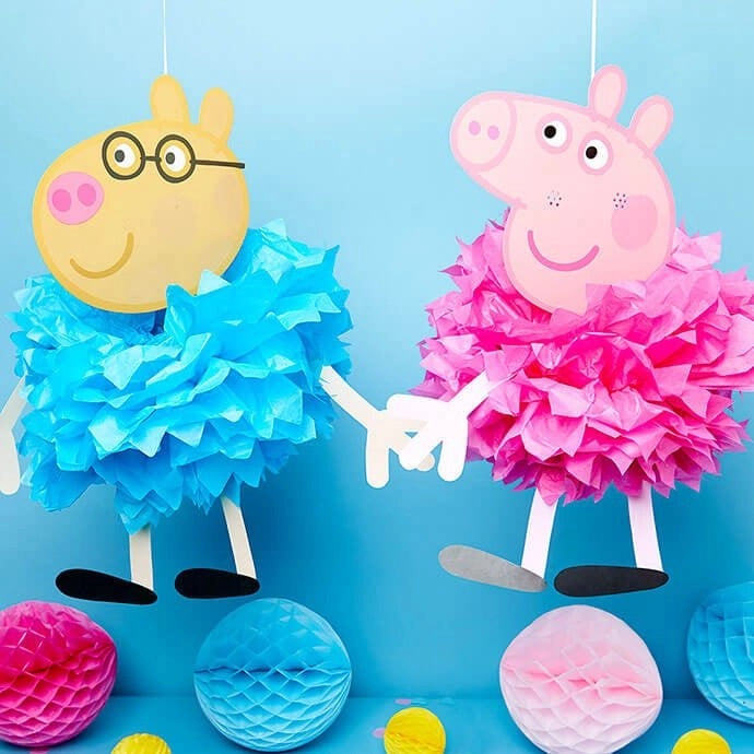 How about making your own Peppa Pig pom poms to decorate the room? All you need is these paper pom poms in pink, green and blue, a pack of Peppa Pig masks and our