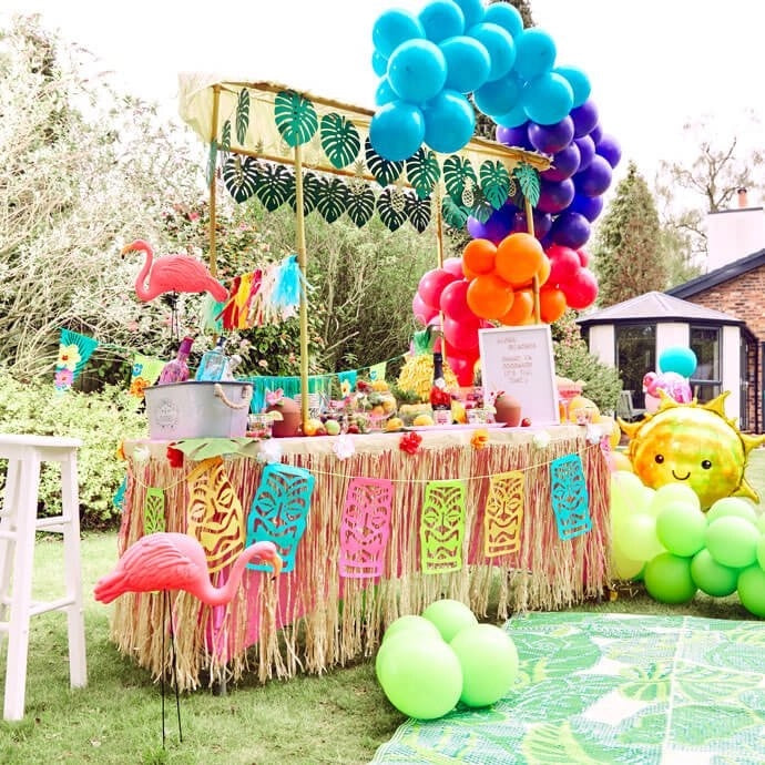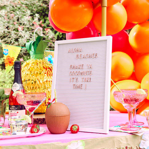 We created the fabulous set-up using palm leaf bunting around the top of the bar, interspersed with this gold pineapple garland and Tiki bunting around the table. We then incorporated a twisted balloon arch made of bold and bright balloons to inject a rainbow of colour, plus a cute smiling sunshine balloon for added good vibes! There are so many summer décor options to choose from, after all, it is your personal beach club! Pretty much anything with pineapples, hibiscus flowers and palm leaves is an excellent starting point.
