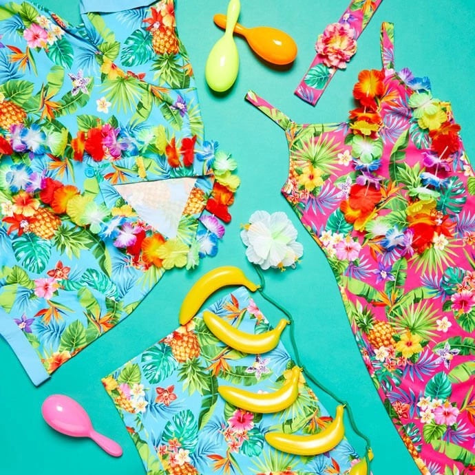 A classic option and one that’s easy to wear (and not too embarrassing if you have to go to the shop) is a Hawaiian shirt or dress. We have a few cool options that don’t need anything added, although a lei, hat, grass skirt or flower hair clip would look great too!