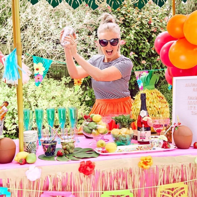 When it comes to summer parties, there’s no such thing as over the top. Decorate around your centrepiece, in this case, your beautiful bar, with balloons, bunting and fun summer items like pineapple honeycomb decorations.
