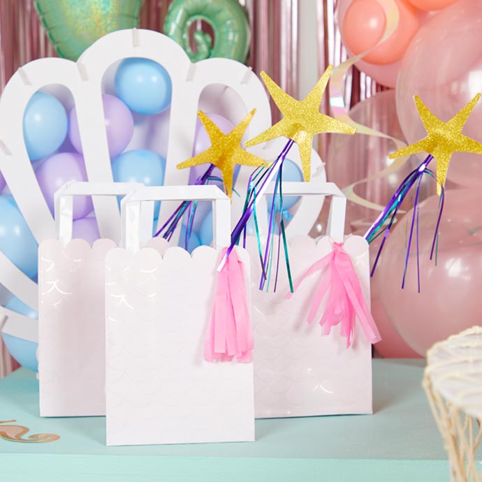 What’s next on the mermaid party wishlist? How about mermaid party bags? We love a party bag, especially when they have pink tissue tassel twine and an iridescent foil scale pattern. These mermaid magic party bags are the perfect thing for holding all the who’s-its and what’s-its galore that you are gifting your party guests at the end of your event.