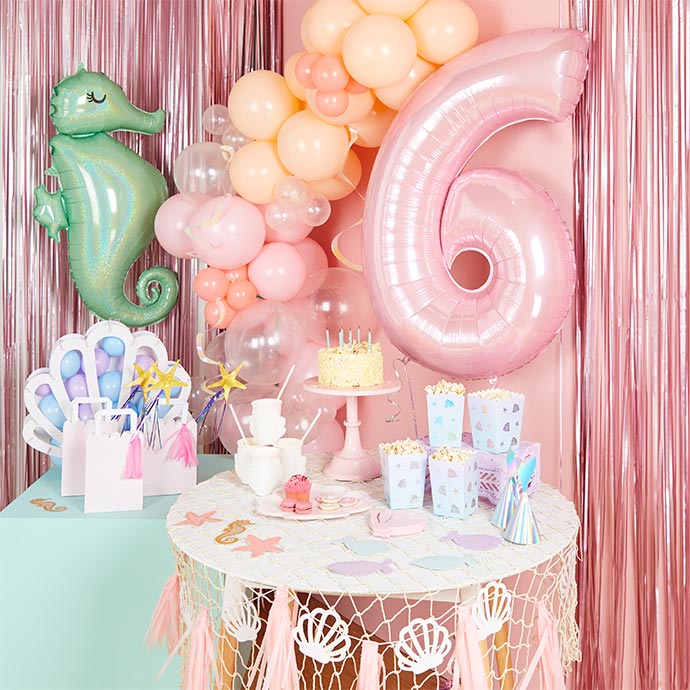 Balloons are a great choice for decorations, especially for giving you a bubble-effect look. You can choose clear bubble balloons or statement balloons like our green SuperSize seahorse balloon or a balloon arch. We also added a giant number balloon to match our colour scheme, in this case, pastel pink!
