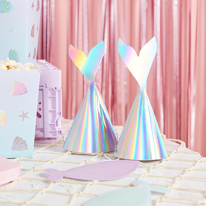 We also added some mermaid tail iridescent party hats to the mix! We love the clever design of these party hats, not to mention the beautiful shine. So they stand out on their special day, you can give the chief mermaid/birthday mermaid a different crown to wear for the day, like this one here.