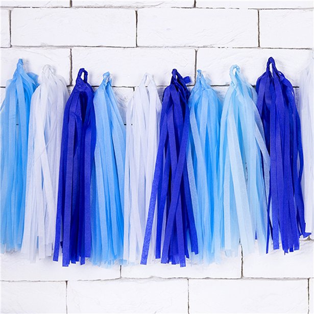 Tassel garland, do it yourself, set contains 12 tassels, (white, blue, sky-blue, navy blue, 3 pcs each) and approx. 2 m of white twine, sizes after assembling: height approx. 30 cm, length approx. 1.5 m.
