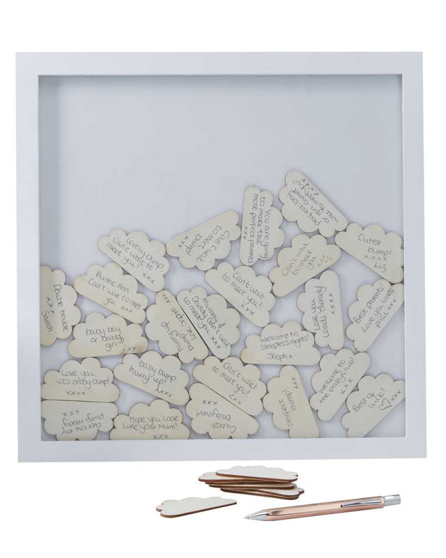 This beautiful white frame will look stunning displayed in your home as a memento of your baby shower. It comes with 3 little wooden clouds that have space for each of your guests to write a message and then drop it into the frame for you to read later.