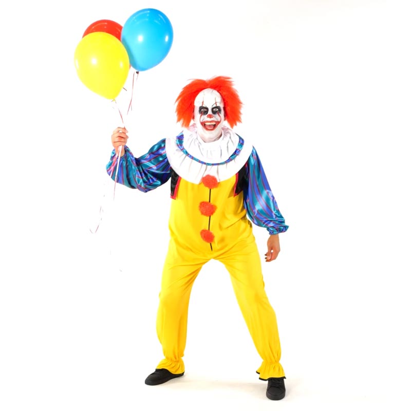 Evoke Tim Curry's classic Pennywise the Clown with this officially licensed - and utterly terrifying - jumpsuit, collar and wig with forehead! The yellow one-piece with fluffy red pom poms and blue sleeves goes perfectly with the terrifying headpiece. Remember to keep a rictus grin on your face and maybe hold onto a few red balloons,