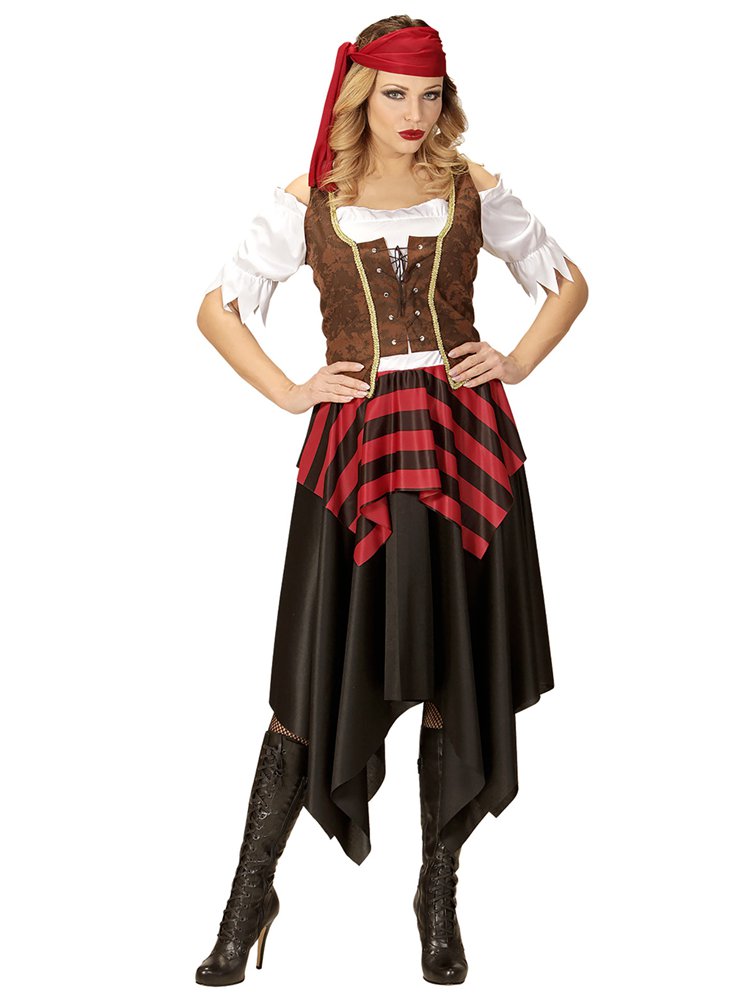 Oooh argh me hearties! This Lady Pirate Costume is ideal for ladies looking for the perfect pirate party look, featuring a dress, corset and headband. A superb Pirate fancy dress costume, just add our Pirate sword and eye patch to show them you mean business and keep the crew shipshape !