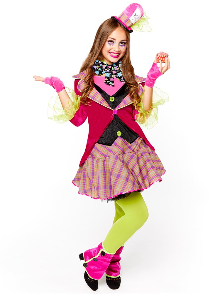 Are you just as mad as the Mad Hatter from Alice in Wonderland? Get the look to go with it with this adorable costume featuring a checked dress with attached black velvet waistcoat and red velvet jacket; the skirt has two layers of black net to add volume and flair. Also included is a bow-tie choker, a pair of pink glovelettes, a pair of neon green tights, a pair of shoe spats with elastic underfoot and a cute little headpiece with clip fastener.