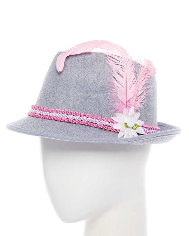 This hat is the perfect choice to complete your Oktoberfest outfit! The grey hat has pretty braid around the brim with a large pink feather with attached flower accent to side.