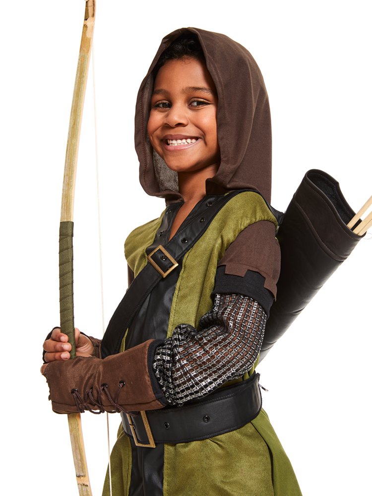 Your little prince will look like he's just stepped out of Sherwood Forest in this five piece archer costume. Just like Robin Hood, he'll look handsome in the hooded shirt with faux leather trim, a lace up neckline and chainmail style sleeves. There are a pair of suede effect glovelets and boot covers, as well as an adjustable belt and over-the-shoulder quiver. A great costume for World Book Day.