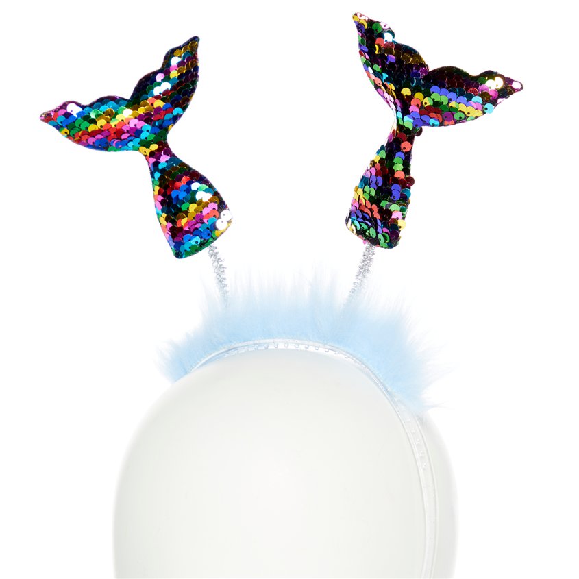 Make a dazzling deep-sea debut with this super sparkly mermaid tail headband. The headband boasts multi-coloured, sequin covered tails with soft blue, faux fur accent. A perfect mermaid accessory, making sure you'll make a splash at your next party !!