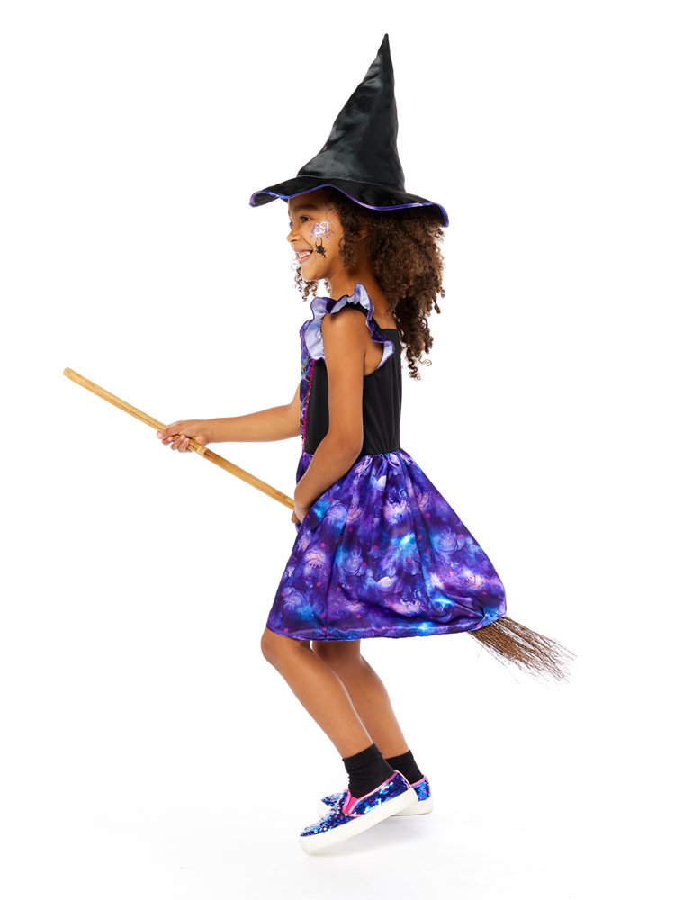 An adorable blue and purple design dress with frilly sleeves, a black bodice with pink star, this little witch's outfit is made complete with a traditional pointy hat.