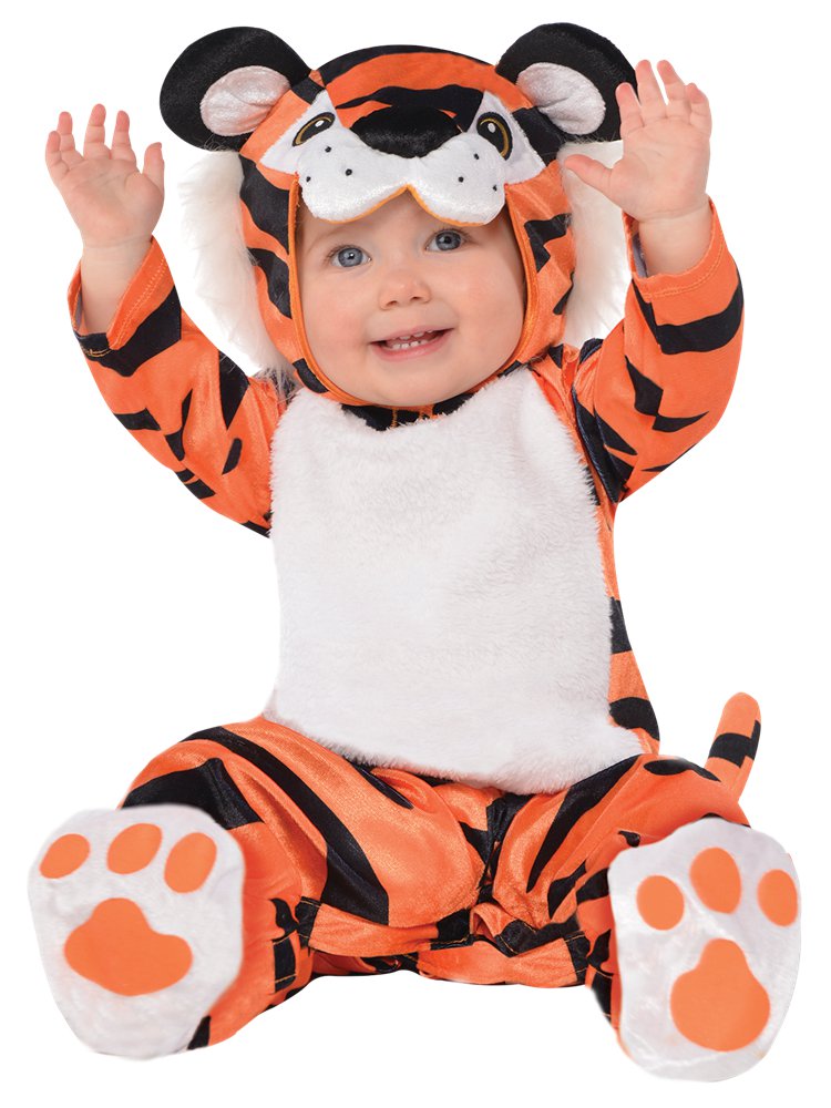 RAWR! ... This tiger jumpsuit features all-over stripes and a velcro release tiger tail. Up the "aww" factor with the tiger head character hood featuring a tiger face, plush ears, and white faux fur. Baby's ready to crawl and prowl in the matching tiger paw booties!