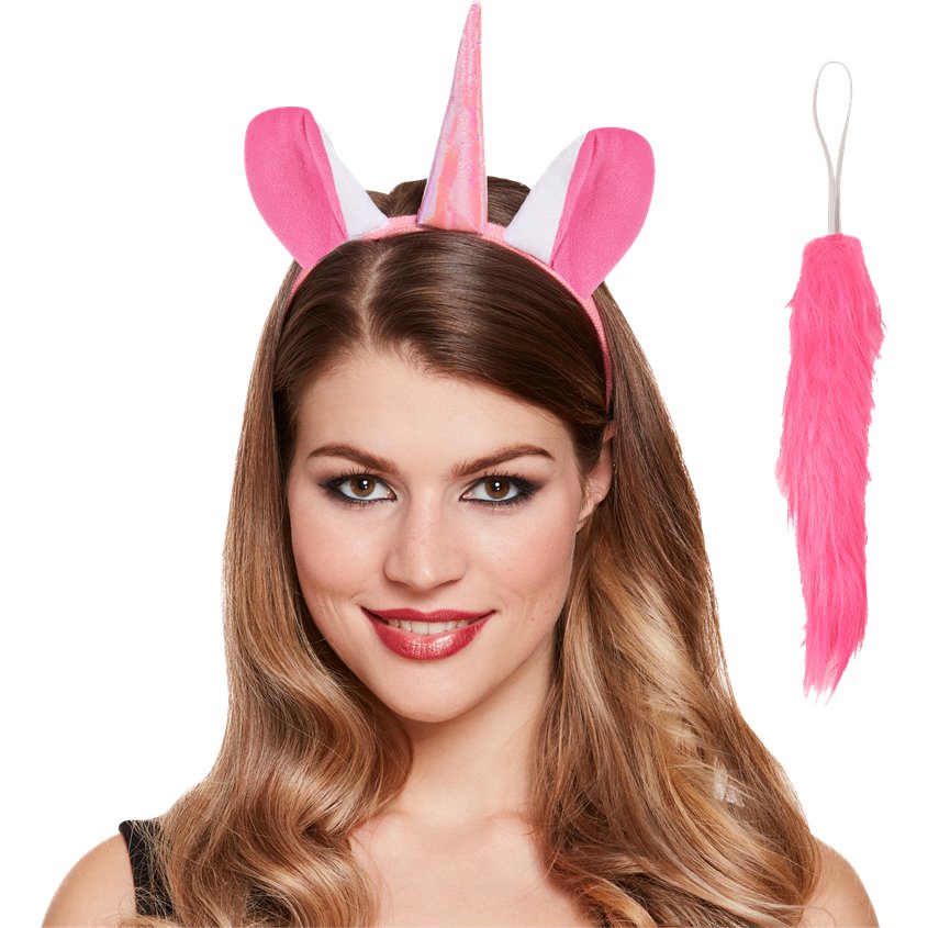 Transform into your favourite magical creature with this unicorn accessory kit. The set includes a pink unicorn attached to a comfortable headband, with soft fabric ears to complete the look. The long fluffy tail features a loop at the top to help secure it to your outfit.