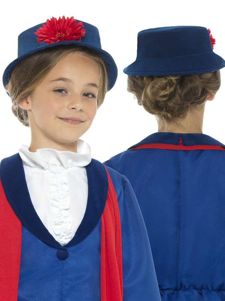 This three piece Victorian Nanny costume includes a blue calf-length dress with attached mock shirt and white trim detail to hemline and cuffs, also included is a red scarf and matching hat with red flower accent.